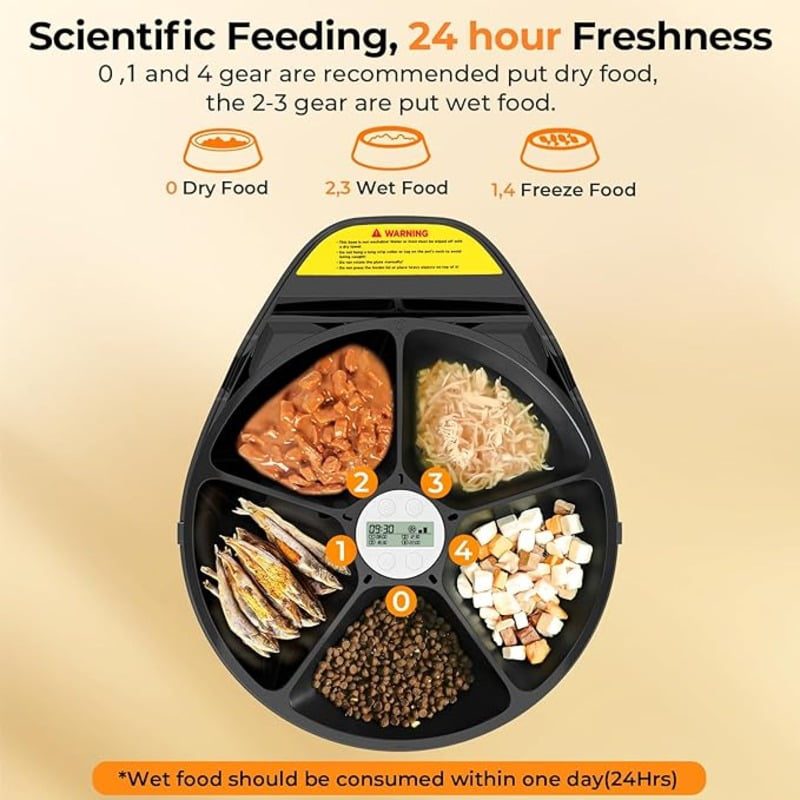 5 Meal Auto Pet Feeder: Automatic cat feeder features 5 individual food compartments, Each portion holds 330ml food. This ensures that their nutritional needs are met while maintaining a healthy feeding routine.